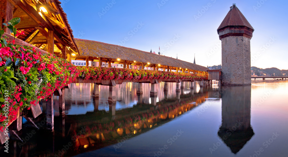 Tableau sur toile Luzern wooden Chapel Bridge and tower panoramic view