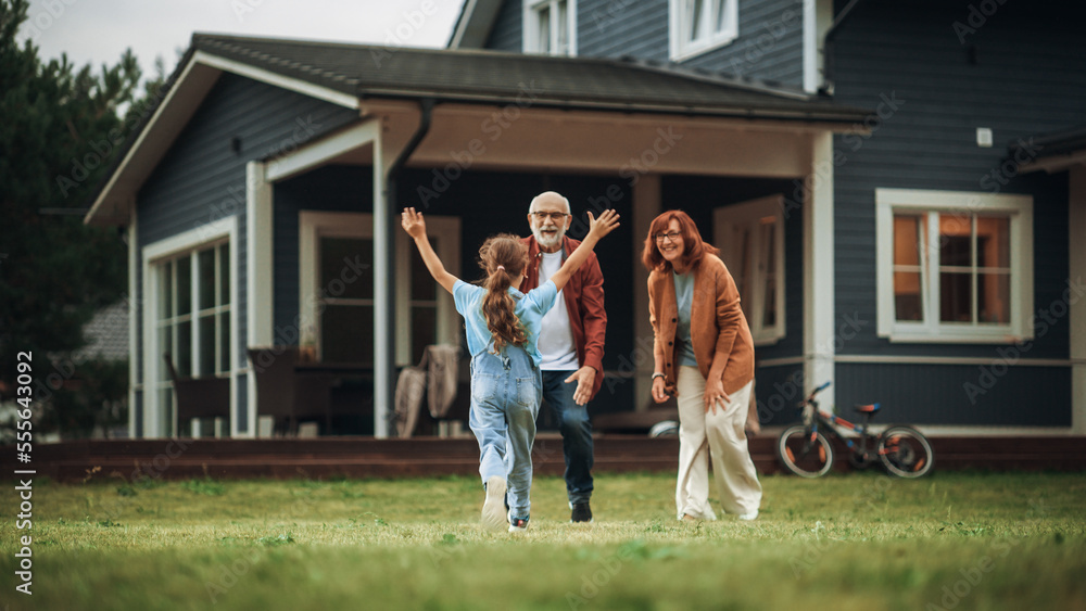 Tableau sur toile Grandfather and Grandmother are Happy to Meet Their Granddaughter in Front of their Suburbs House