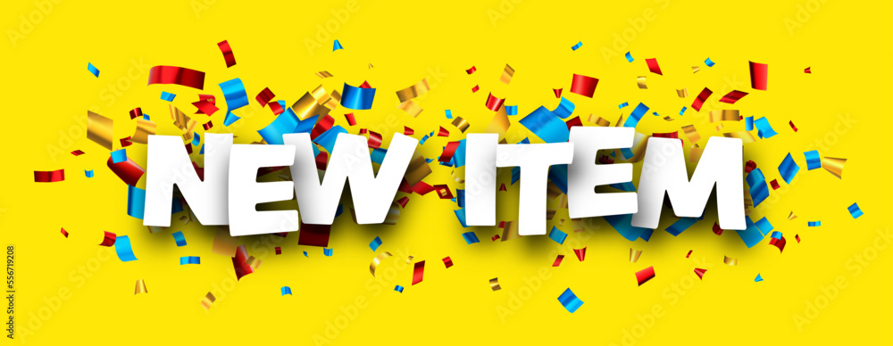 Tableau sur toile New item sign over colorful cut out foil ribbon confetti background