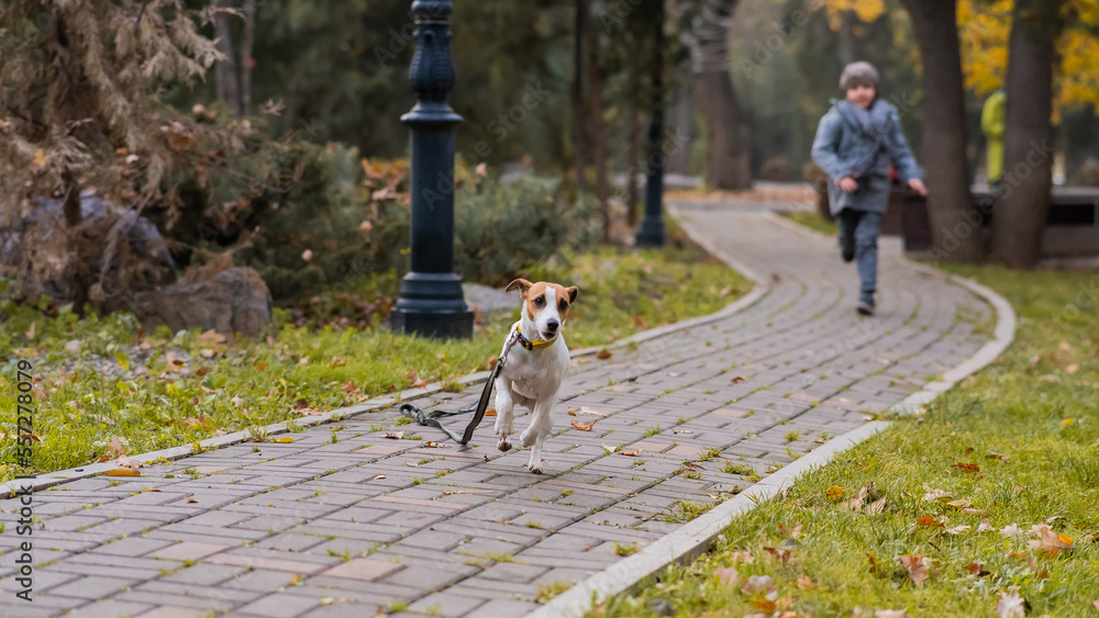 Tableau sur toile The boy runs with the dog Jack Russell Terrier in the park