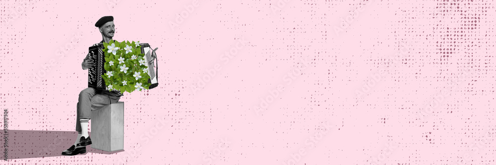 Tableau sur toile Banner with portrait of cheerful young boy playing accordion made of flowers