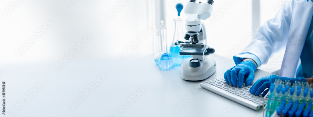 Tableau sur toile Lab assistant, a medical scientist, a chemistry researcher holds a glass tube through the blood sample, does a chemical experiment and examines a patient's blood sample