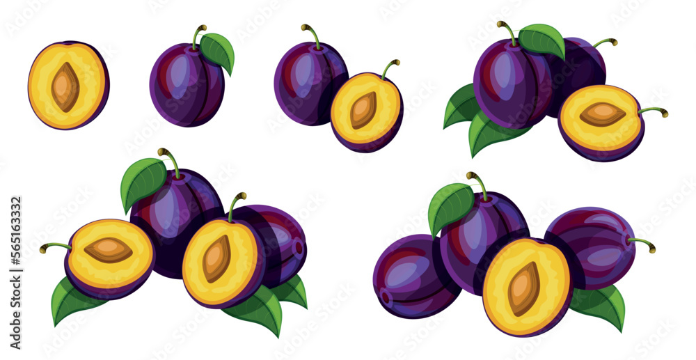 Tableau sur toile Set of fresh purple plums in cartoon style