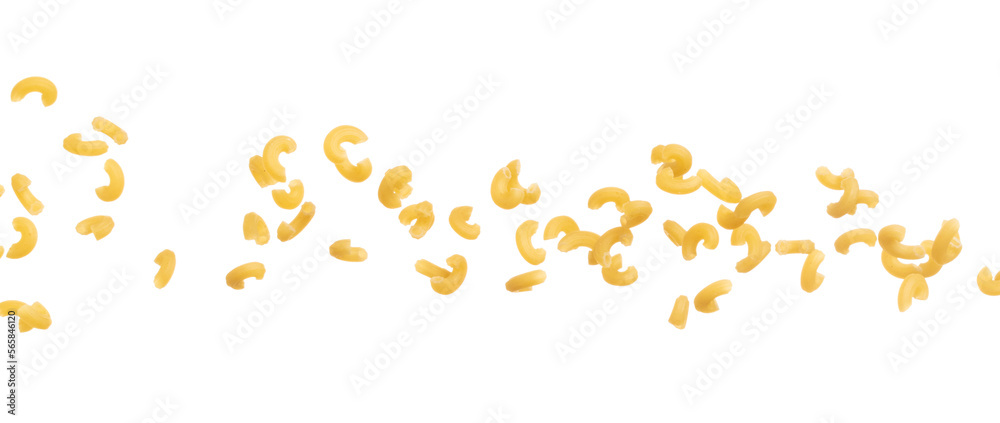 Tableau sur toile Macaroni fall down in group, yellow macaronis pasta float explode, abstract cloud fly