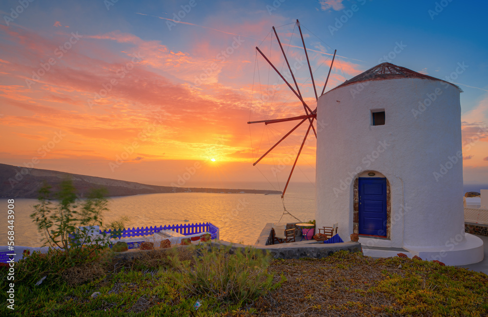Tableau sur toile windmill at beautiful sunset on oia Santorin