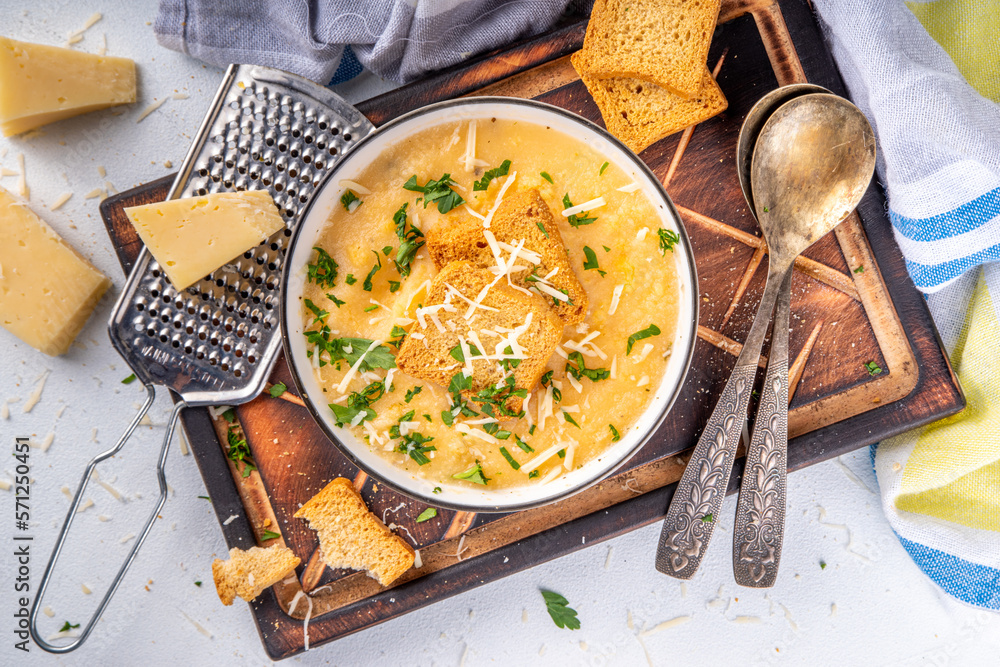 Tableau sur toile Homemade cheese cream soup, cheddar parmesan soup with croutons and greens, on w