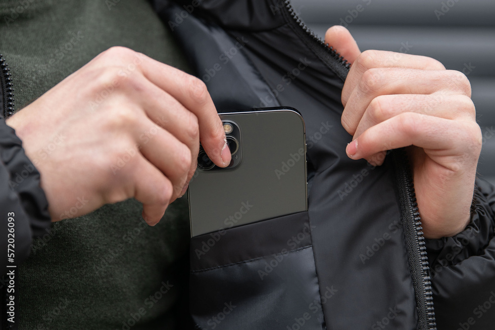 Tableau sur toile The man puts the phone in the inner pocket of his black jacket