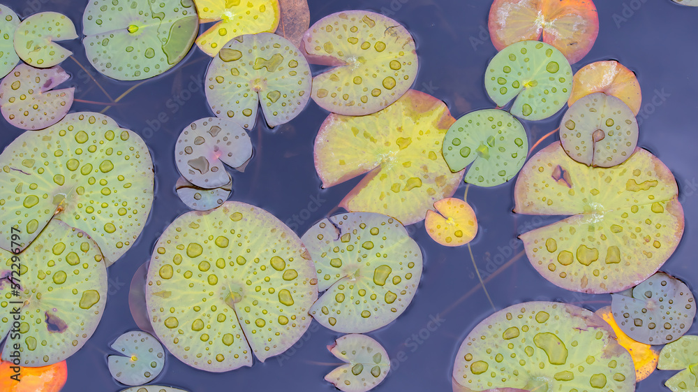 Tableau sur toile Lily Pads in a Garden Pond during a Spring Rain Water Lilies Green, Yellow , Col