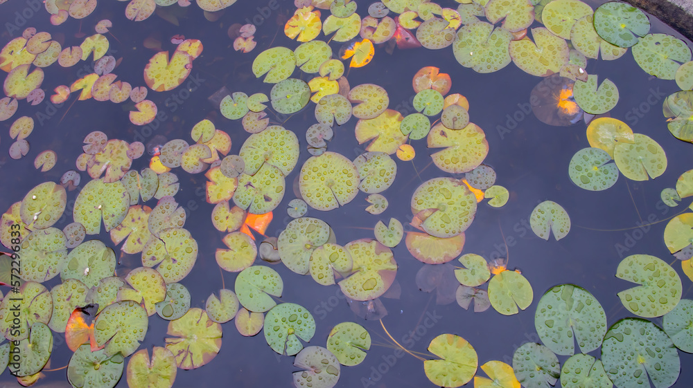 Tableau sur toile Lily Pads in a Garden Pond during a Spring Rain Water Lilies Green, Yellow , Col