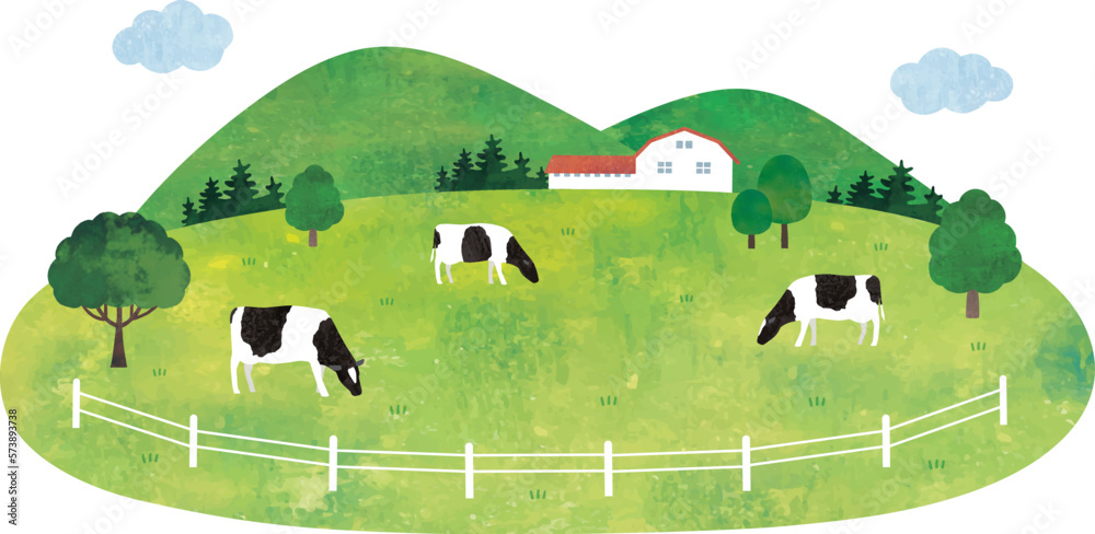 Tableau sur toile 芝生の牧場と山と牛の挿絵的な景色