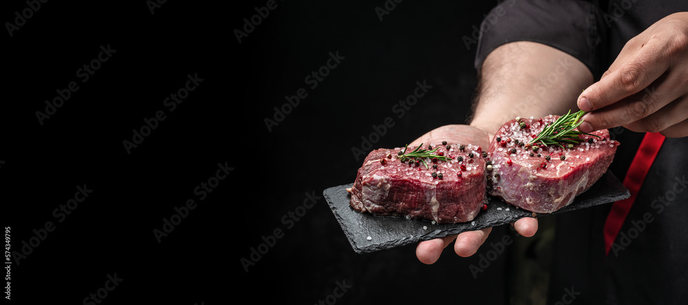 Tableau sur toile Beef medallions with rosemary and spices, Raw beef meat steak Tenderloin fillet on a dark background