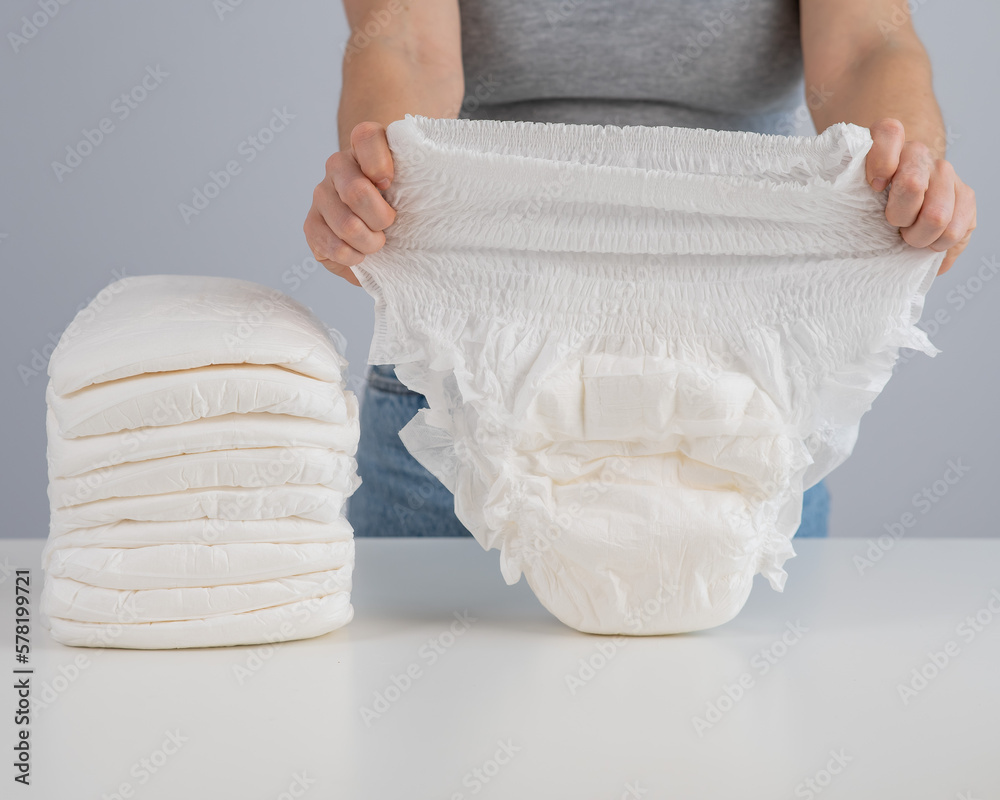 Tableau sur toile A woman chooses an adult diaper from a pile