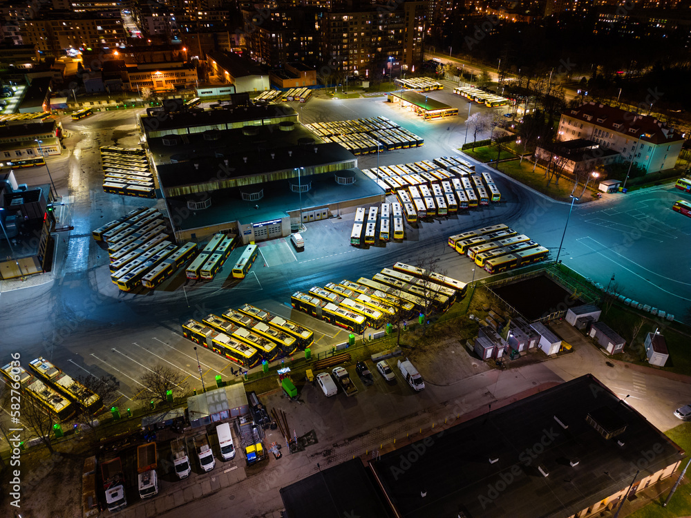 Tableau sur toile Night aerial view of bus depot