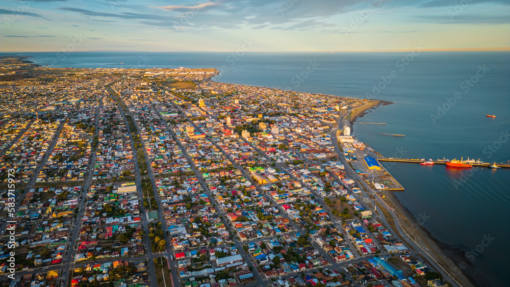 Tableau sur toile Aerial Drone Fly Above City of Punta Arenas Chile, Panoramic Cityscape in Summer