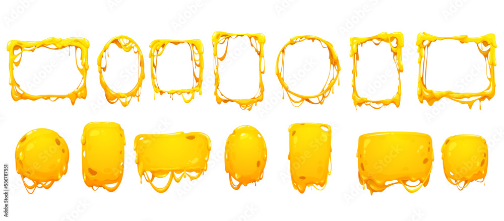 Tableau sur toile Cheese melt frames and borders of yellow sauce drips, vector Cheddar, Parmesan or Mozzarella
