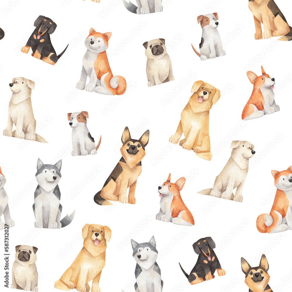 Tableau sur toile Watercolor seamless pattern with cartoon dog breeds