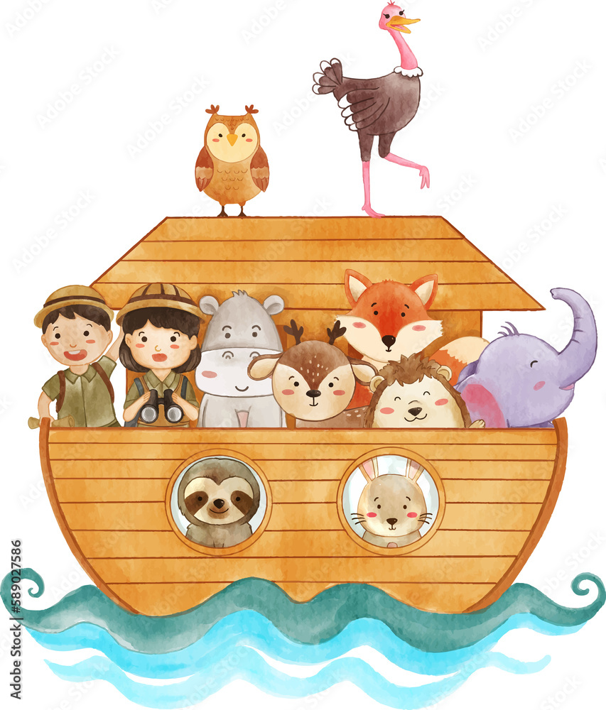 Tableau sur toile Noah 's ark with many wildlife animals . Watercolor .