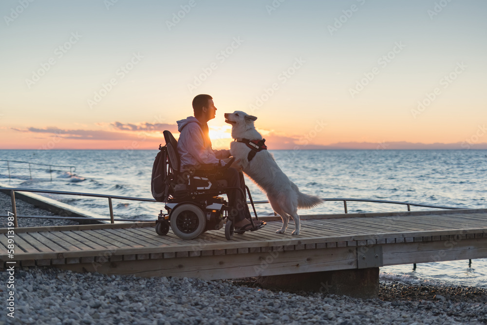 Tableau sur toile Man with disability with his service dog at sunset using electric wheelchair