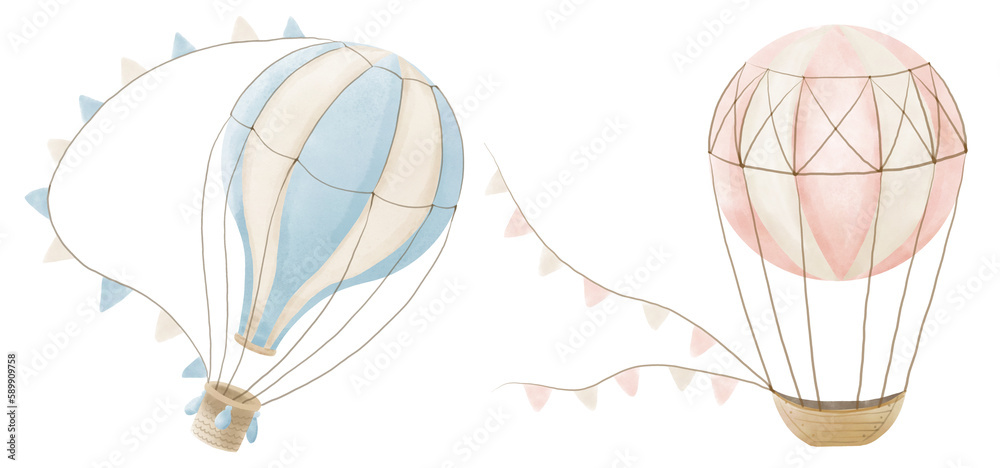 Tableau sur toile Set of Hot Air Balloons in pastel blue and pink colors for Baby Shower