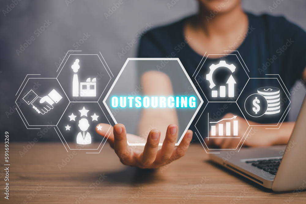 Tableau sur toile Outsourcing Global Recruitment Business and internet concept, Business person hand holding outsourcing icon on virtual screen with blue bokeh background