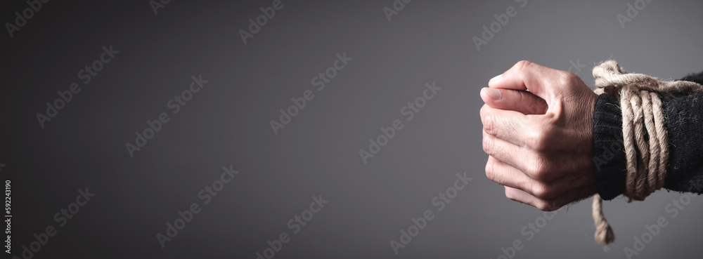 Tableau sur toile Hands tied with a rope. Concept of imprisonment
