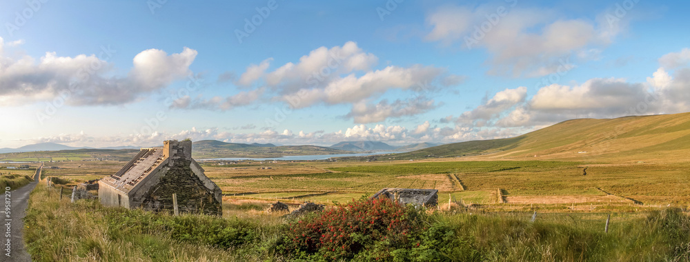 Tableau sur toile Weidelandschaft Panorama und Ruine bei Portmagee