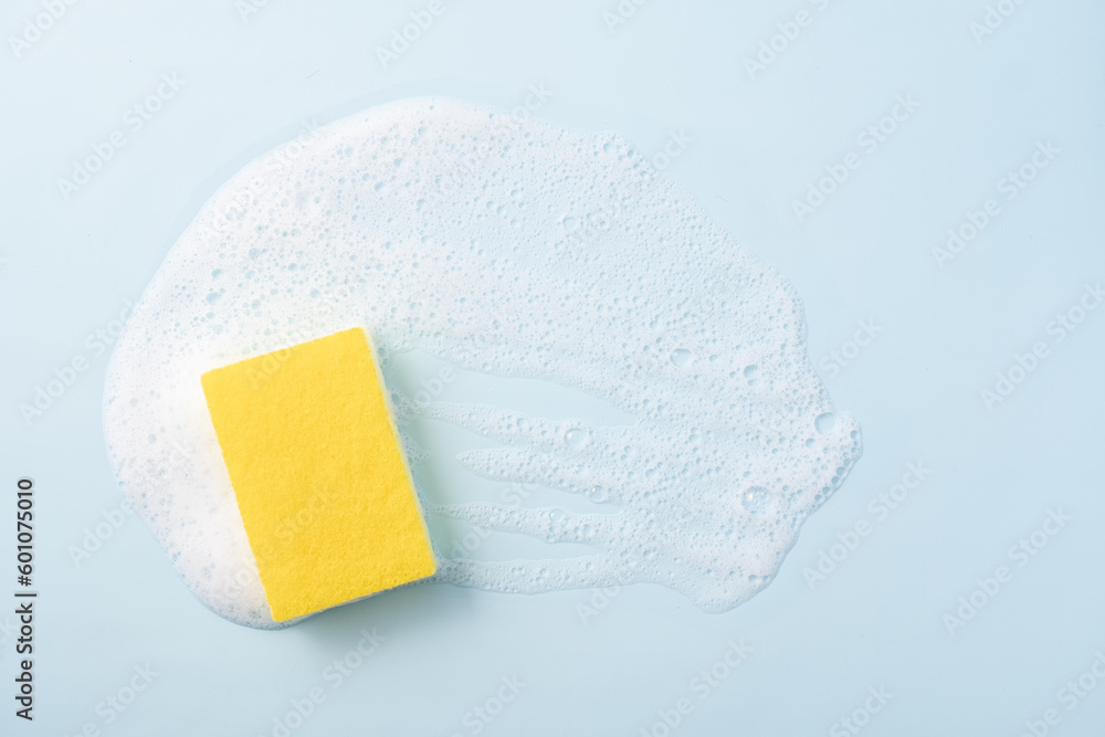 Tableau sur toile Cleaning sponge and a soapy foam on a blue background