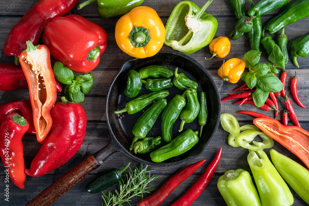 Tableau sur toile a colorful assortment of peppers, hot peppers and chili, decorated with various assesoires on a wooden table