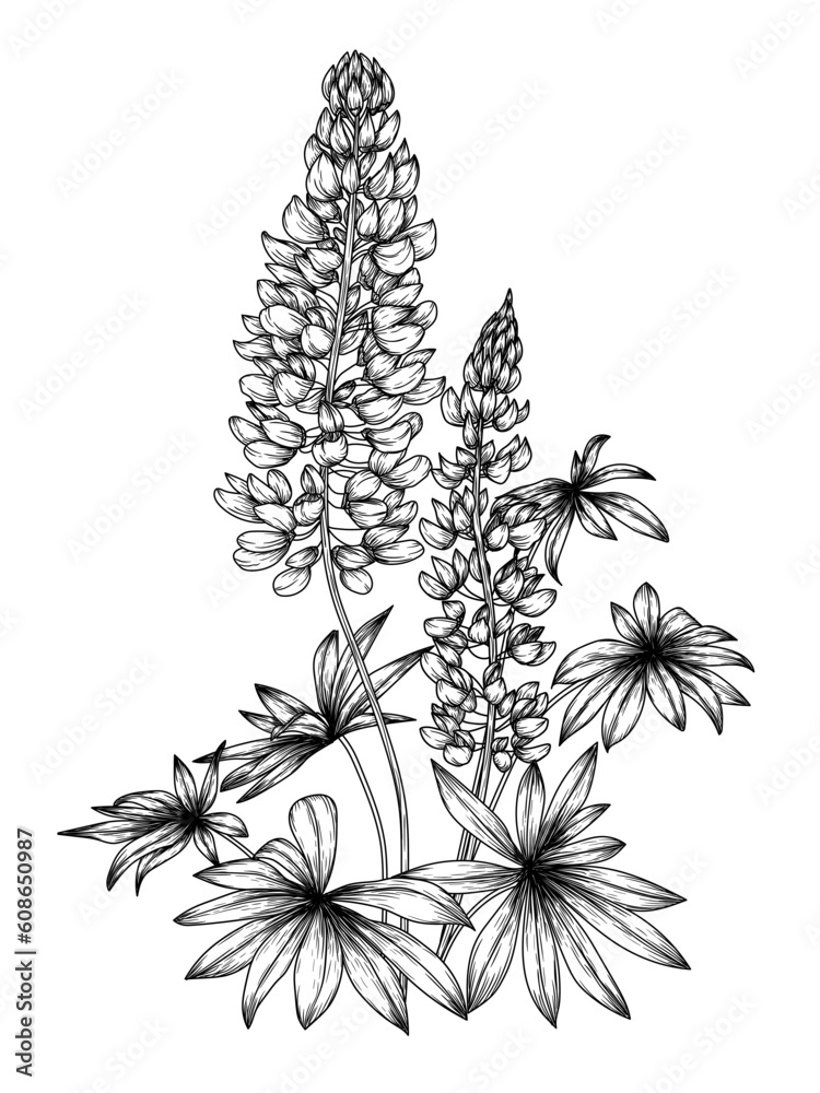 Tableau sur toile Vector illustration of lupine flower in engraving style