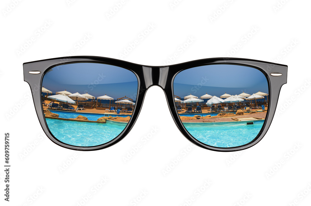 Tableau sur toile Black sunglasses with pool resort reflection isolated