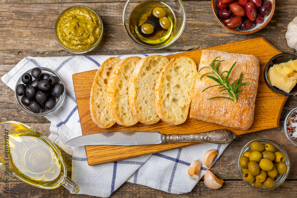 Tableau sur toile Italian ciabatta bread cut in slices with herbs, olives, pesto sauce, garlic and parmesan cheese on a wooden table