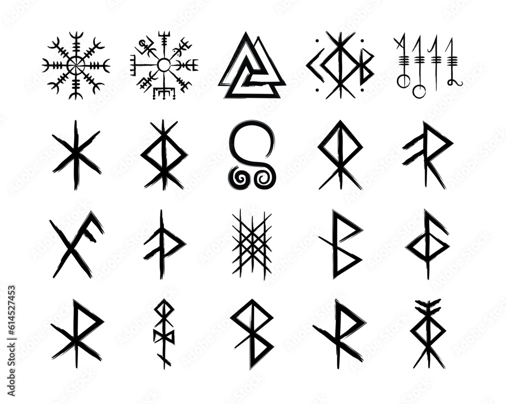 Tableau sur toile Full editable collection of norse symbols with meanings like protection, love, healing, safe travelling, compass, good luck, brave or courage and more