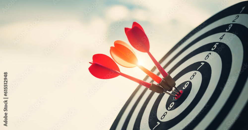 Tableau sur toile Close up shot of the dart arrow hit on bulleyes of dartboard to represent that the business reached the target with dark tone picture style