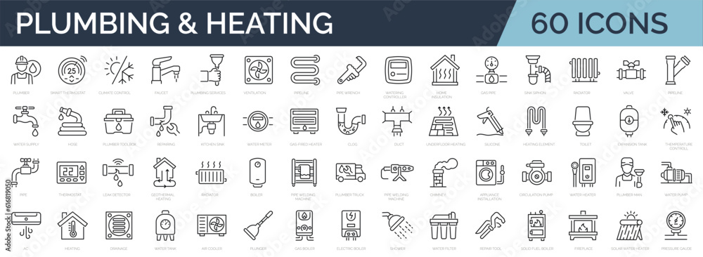 Tableau sur toile Set of 60 outline icons related to plumbing, heating, ventilation, construction, renovation