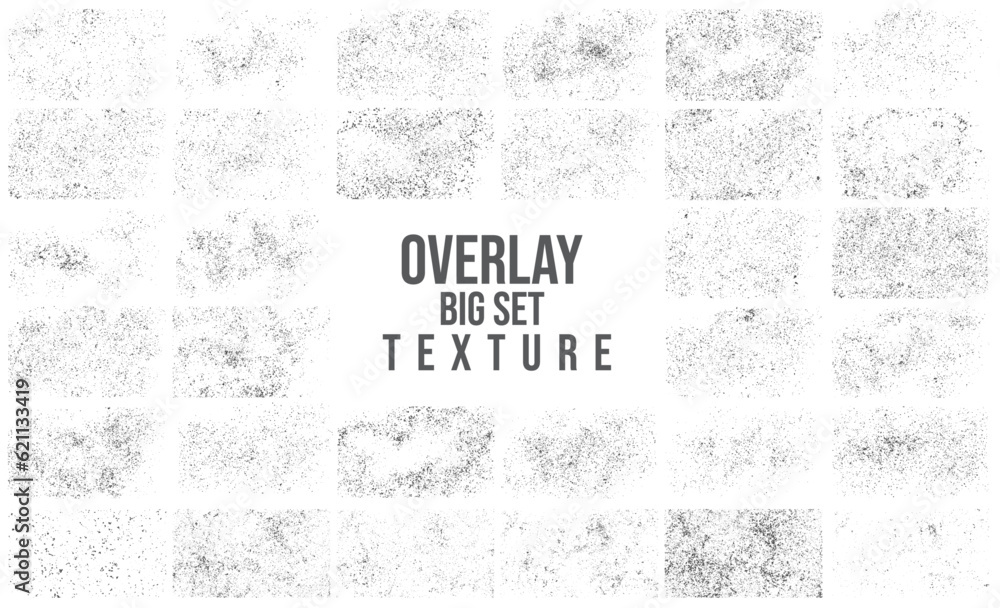 Overlay textures set stamp with grunge effect. Old damage Dirty grainy and scratches. Set of different distressed black grain texture. Distress overlay vector textures.