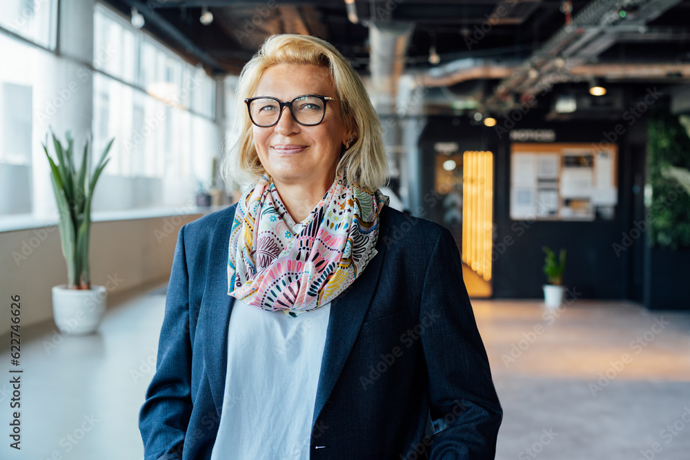 Tableau sur toile Portrait of smiling 50's stylish, confident mature businesswoman, middle aged company ceo director, experienced senior female professional, business coach team leader in modern office