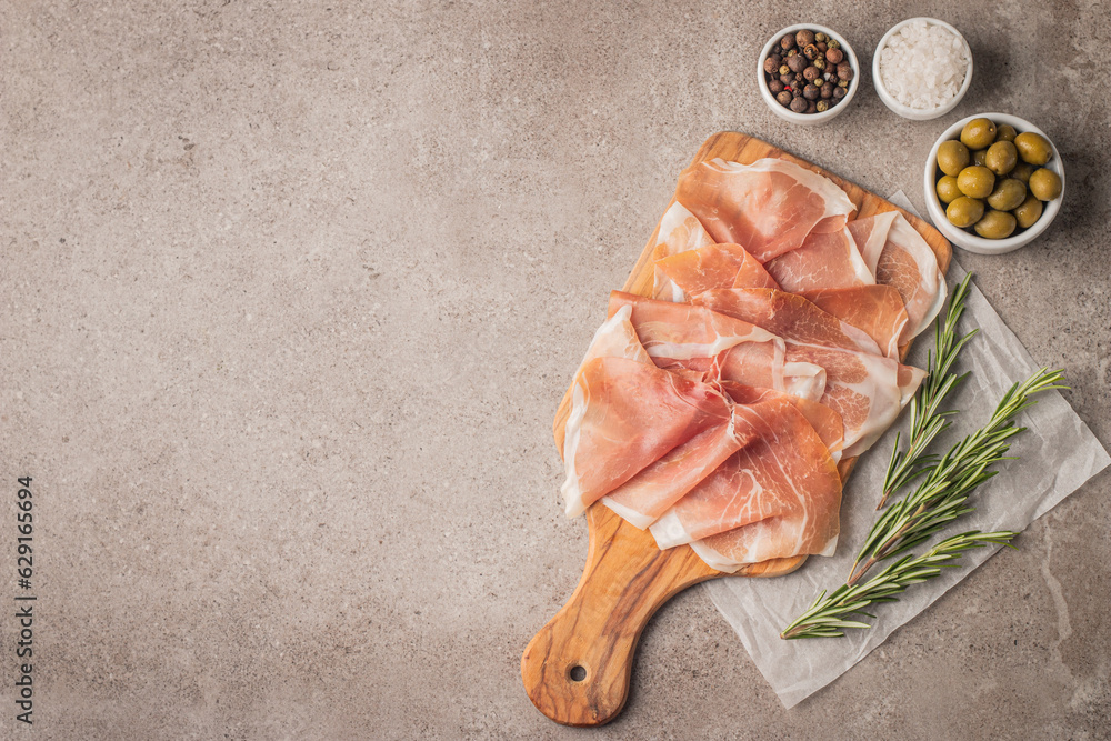 Tableau sur toile Thin slices of Italian prosciutto with green olives, spices and rosemary on wooden cutting broad