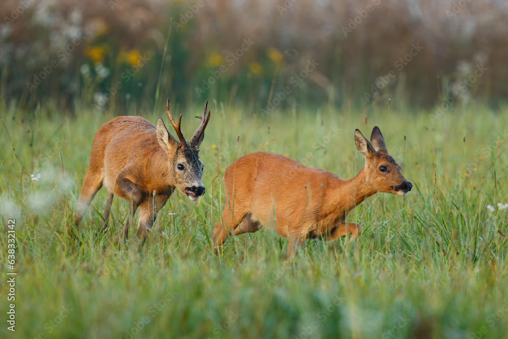 Tableau sur toile Roe deer buck with big antlers chasing doe on the meadow in rutting season