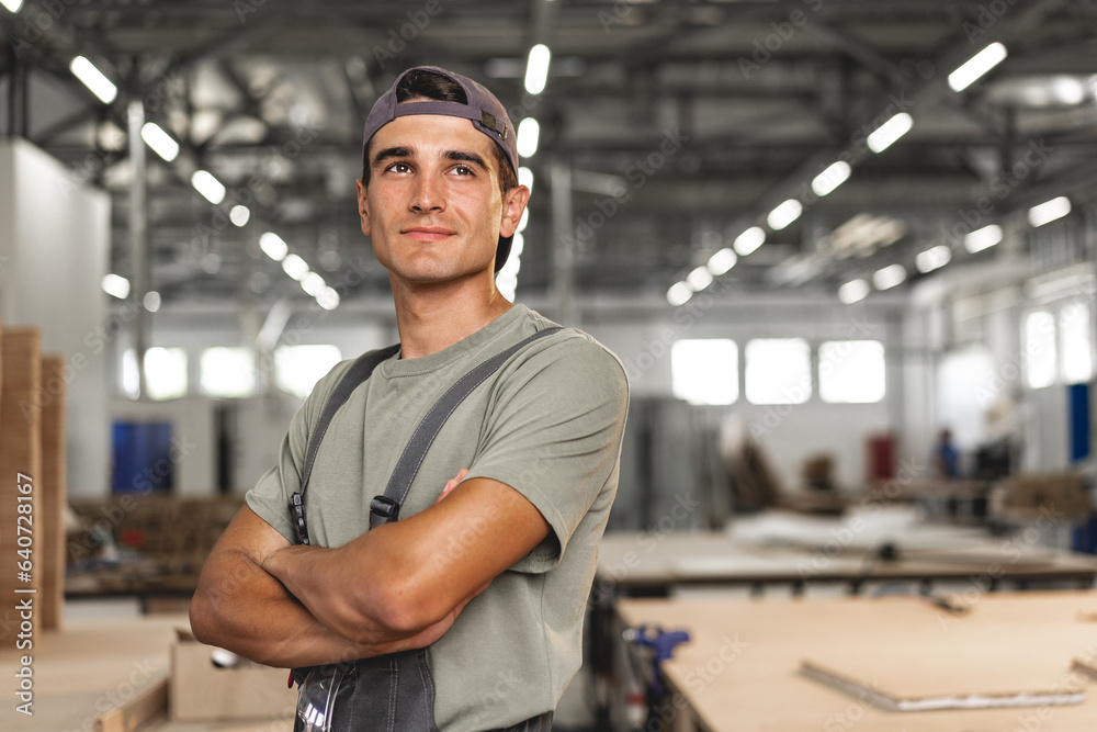 Tableau sur toile Portrait of young male carpenter standing in the wood workshop
