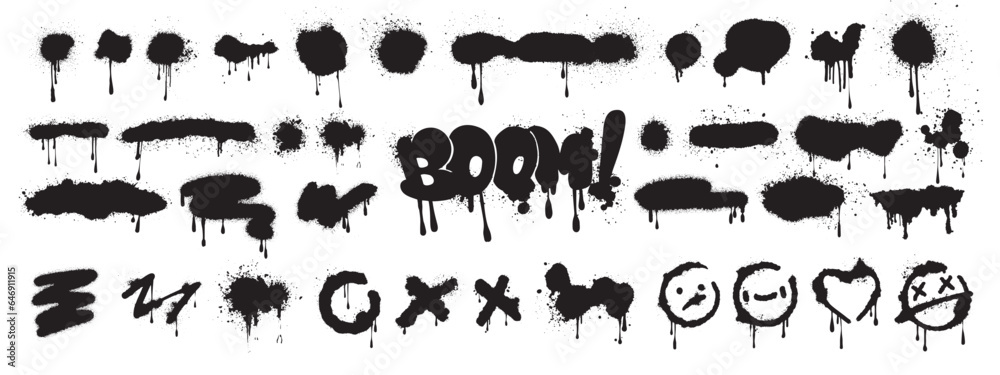 Tableau sur toile Spray graffiti element set, vector can splatter brush drip freehand kit, urban street black grunge