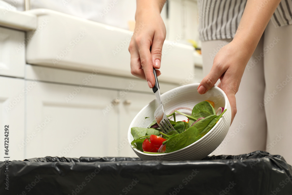 Tableau sur toile Woman throwing vegetable salad into bin indoors, closeup