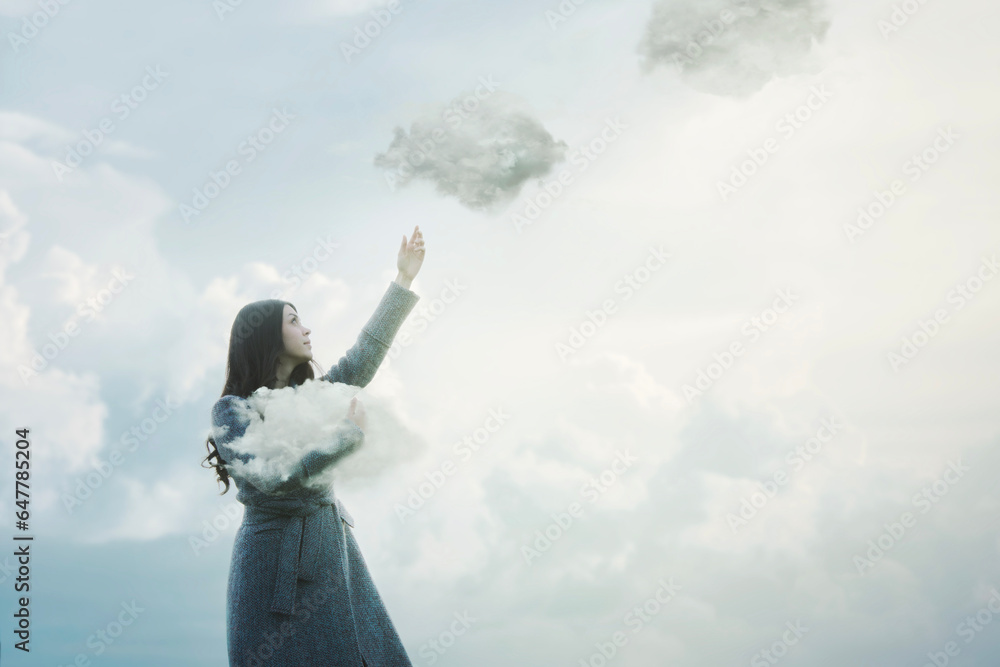 Tableau sur toile surreal woman is releasing the clouds that she was holding in her arms into the
