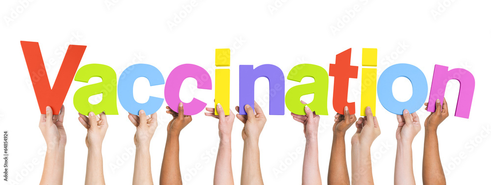 Tableau sur toile Multiethnic Arms Raised Holding Text Vaccination