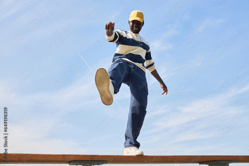 Tableau sur toile Minimal fashion shot of young black man wearing trendy outfit standing on roof against blue sky and kicking off to camera