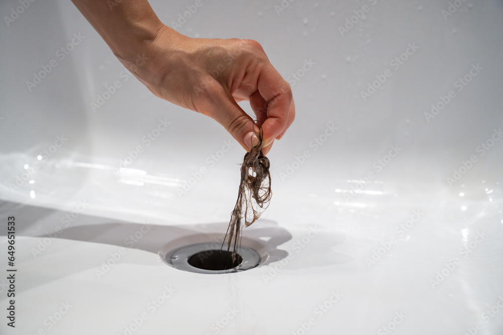 Tableau sur toile Water drain hole in bath is clogged with hair clump in bathroom at home