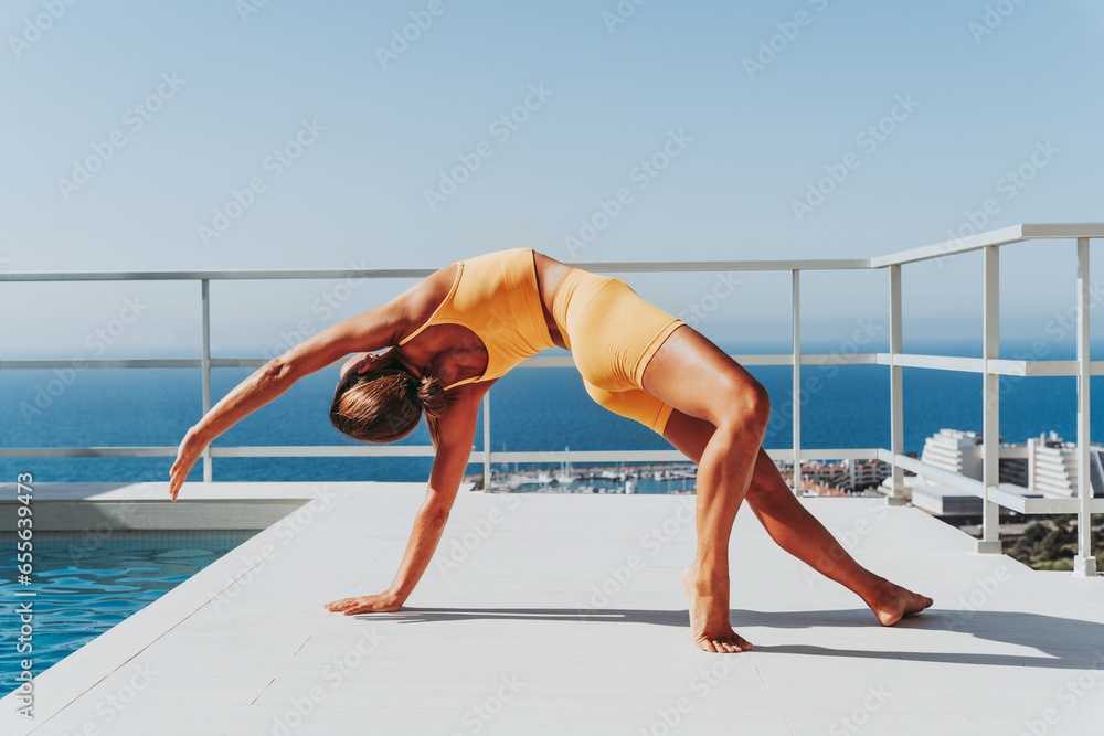 Tableau sur toile Beautiful young atlethic woman wearing sportswear doing yoga meditation on the t