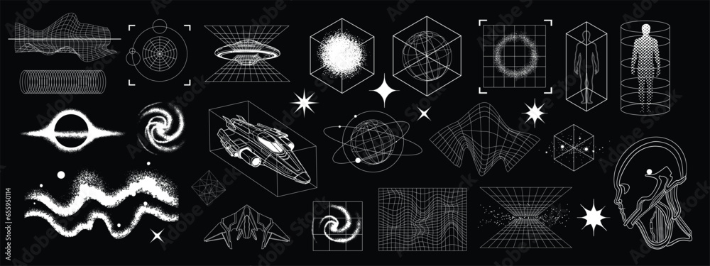 Tableau sur toile 3D cyberpunk grid u2k wireframe shape set, warp retro futuristic geometric icon vector collection