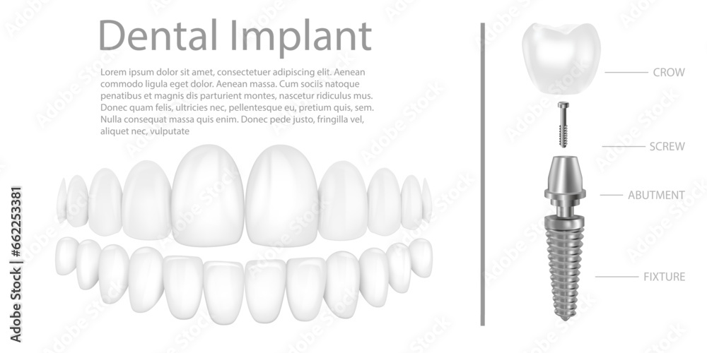Tableau sur toile Dental implant structure medical pictorial educative infographic poster with molar replacement end healthy tools models vector illustration