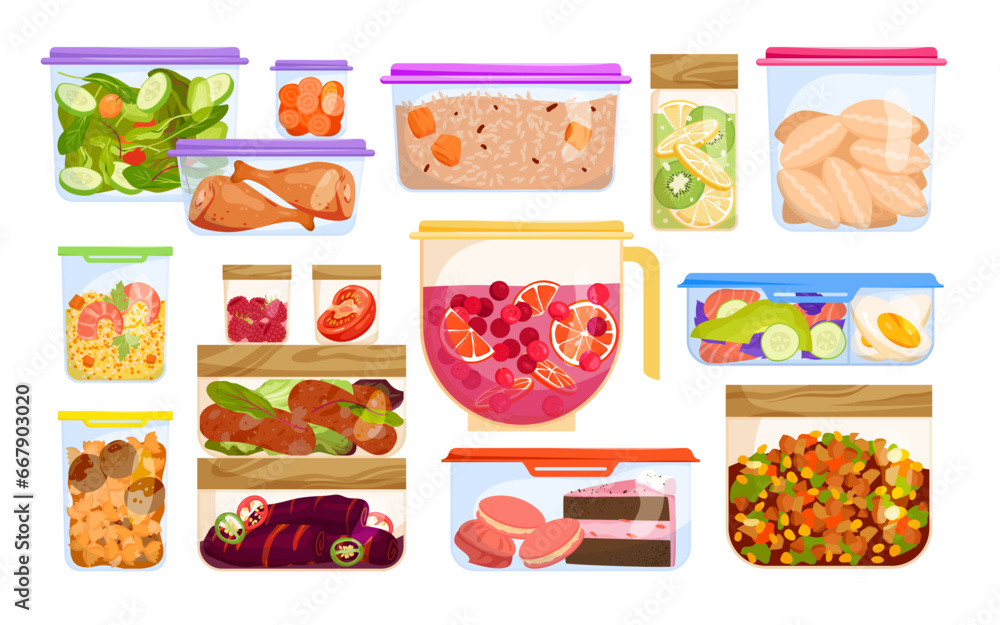 Tableau sur toile Cartoon isolated glass and plastic containers collection with healthy meal left over from dinner or lunch, food organization and storage in home fridge