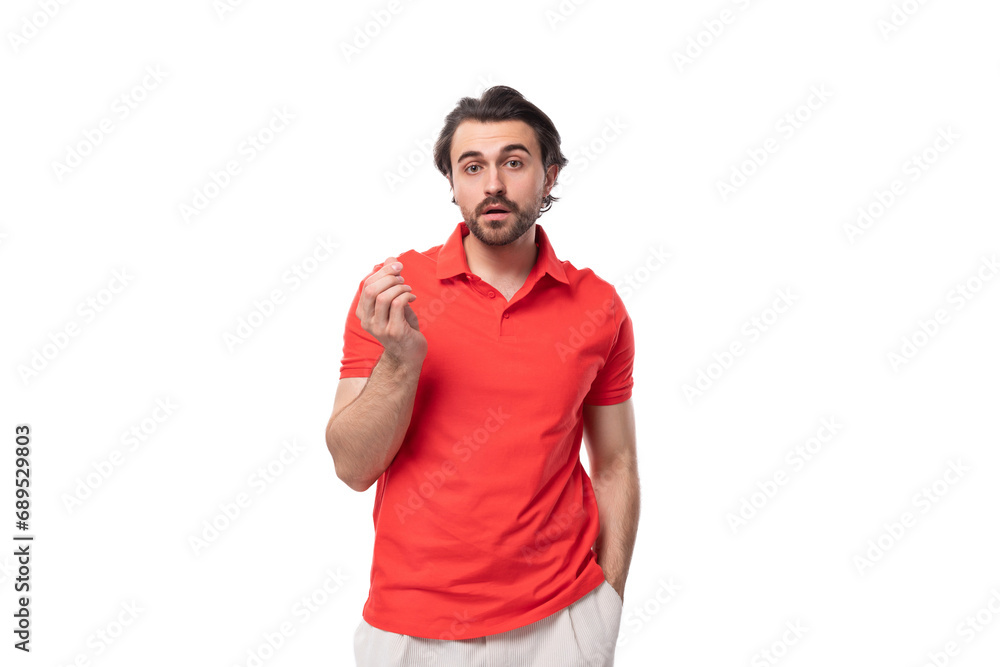 Tableau sur toile young handsome european brunette man with a beard dressed in a red t-shirt with